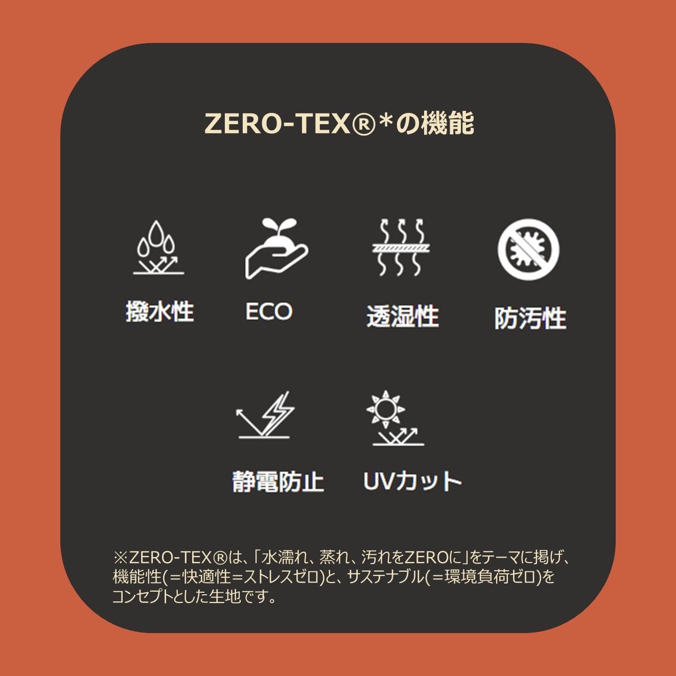 ZERO-TEX?は、「水濡れ、蒸れ、汚れをZEROに」をテーマに掲げ、機能性(=快適性=ストレスゼロ)と、サステナブル(=環境負荷ゼロ)をコンセプトとした生地です。